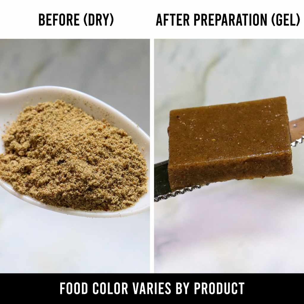 Bring water to a boil on stove, in microwave or kettle. Pour boiling water into a bowl and immediately stir in powder (1 part powder to 2-3 parts water). Let cool or immediately pour into mold. Gel will set at room temperature. Cut into pieces or make into a slow release Jerky. Once made, gel should be treated as fresh food and can be sealed and stored in refrigerator for up to two weeks, or freezer for up to six months.