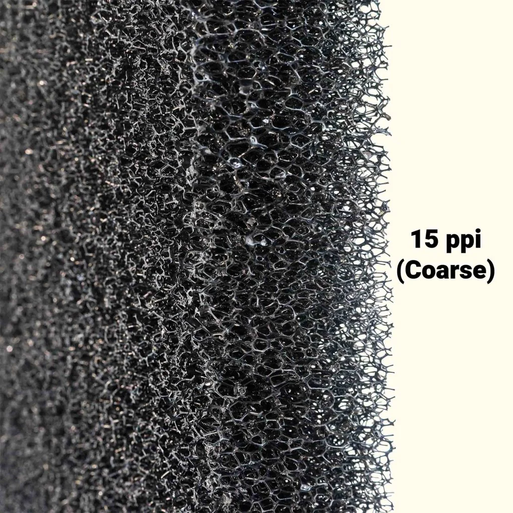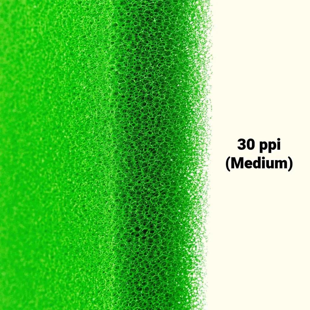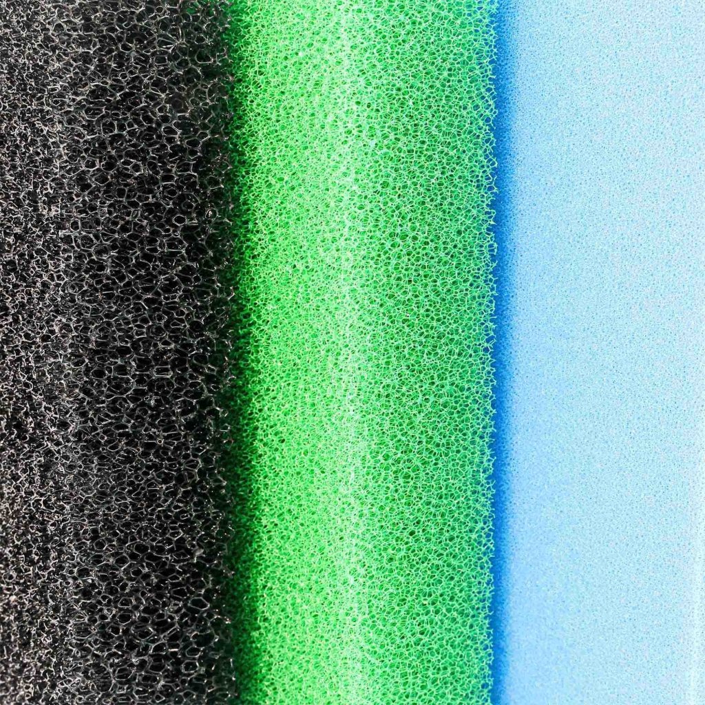 These 2 inch thick reusable sponge pads come in three porosities. Black 15ppi being the most coarse and slowest to clog. The green 30ppi which is less coarse and should be the majority of the sponge used in a filter. The blue pad is 40ppi and is a fine polishing pad and will require frequent cleaning but will remove the most from your water to help get a crystal clear look.Â